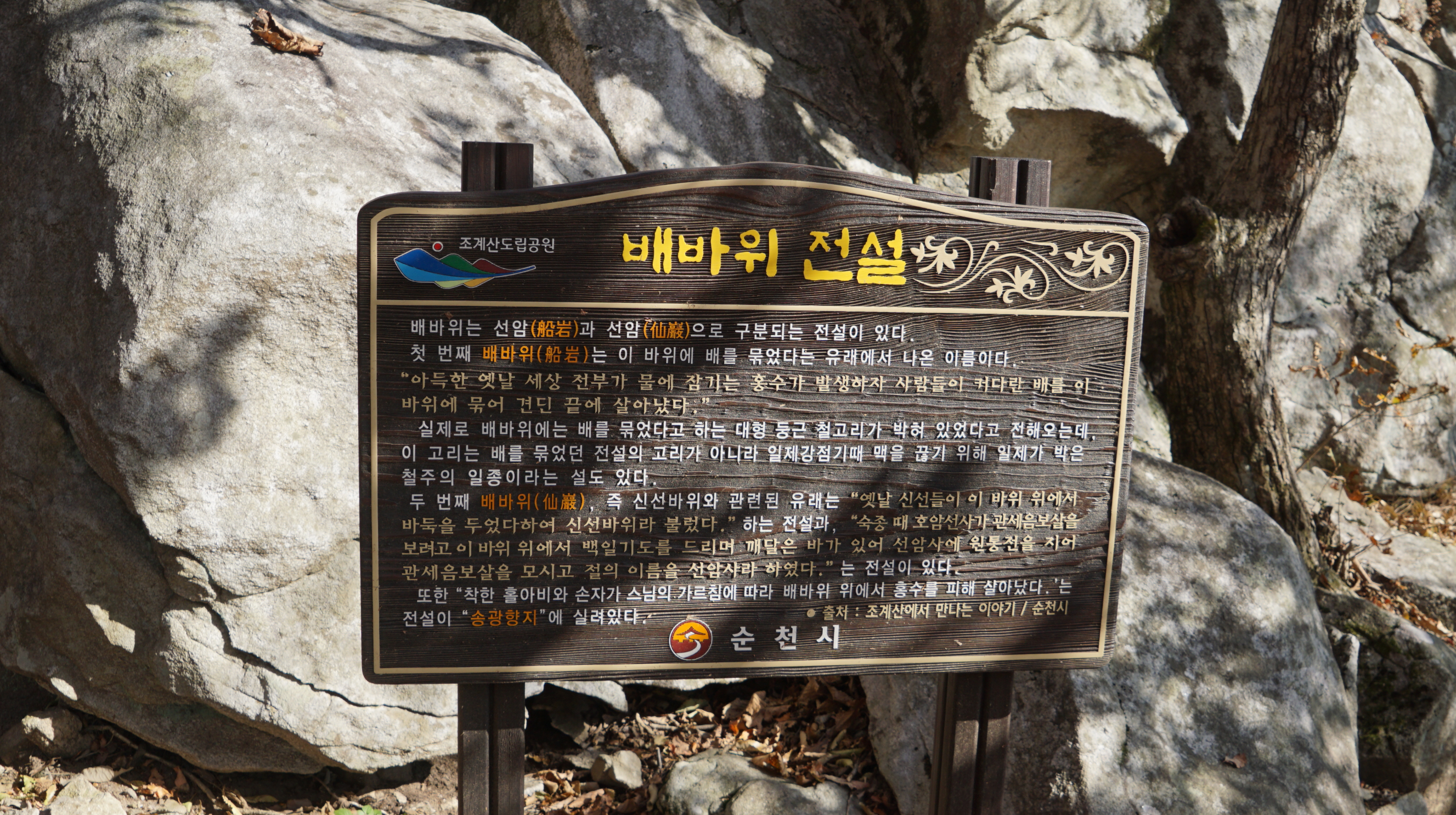 이 전설은 배바위를 단순한 기암괴석이 아니라, 구원의 방주이자 신성한 피난처로 격상시킨다. 바위 꼭대기에 오르면 선암사 일대가 한눈에 들어오는 등 뛰어난 조망을 자랑하는데 , 전설을 알고 이곳에 서면 눈앞의 풍경이 더욱 신비롭게 다가온다. 이처럼 조계산의 바위와 봉우리는 각각의 이름과 이야기를 통해 지질학적 대상을 서사의 주인공으로 변모시킨다.