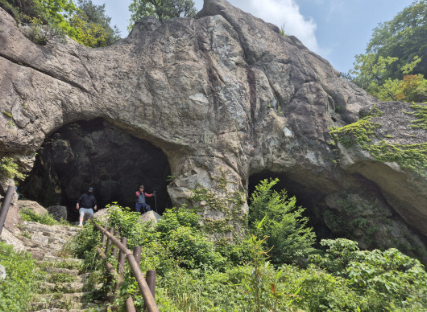 - 쌍홍문(雙虹門): 금산 38경 중 으뜸으로 꼽히는 '쌍무지개 문'이다. 원효대사가 두 개의 굴이 쌍무지개 같다 하여 이름 붙였다고 전해지는 천연 석문으로, 금산의 상징과도 같은 존재다. 일부에서는 해골 모양으로 보이기도 한다고 말한다.