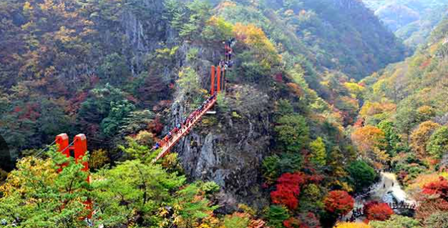 강천사를 지나면 여행의 스릴을 더하는 현수교(懸垂橋), 일명 구름다리가 나타난다. 1980년에 조성된 이 붉은색 다리는 높이 50m, 길이 75m로, 아래에서 올려다보는 것만으로도 아찔함을 선사한다. 최대 50명이 동시에 건널 수 있으며, 걸음을 옮길 때마다 가볍게 흔들리는 다리 위에서 바라보는 계곡의 풍경은 공포심마저 잊게 할 만큼 아름답다.