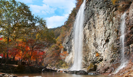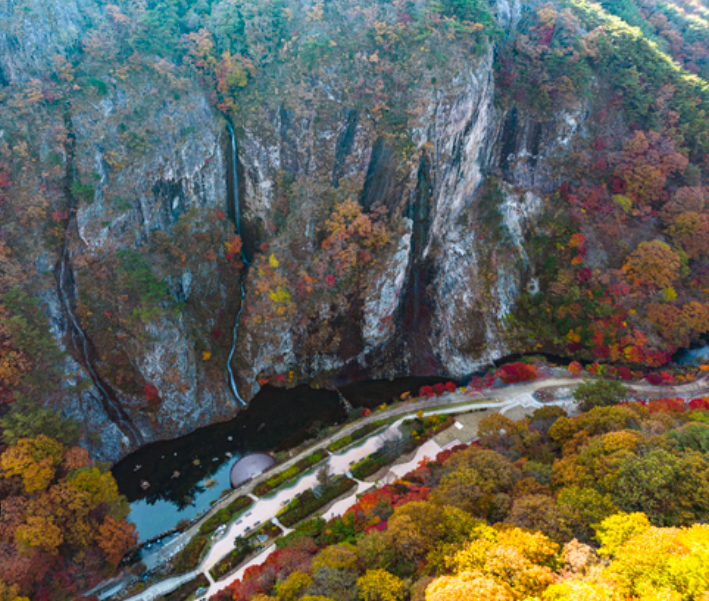 여행의 시작은 매표소를 들어서자마자 마주하는 **병풍폭포(屛風瀑布)**다. 높이 40m, 폭 15m의 이 인공폭포는 병풍처럼 둘러쳐진 거대한 암벽을 배경으로 시원한 물줄기를 쏟아낸다. 자연 암반을 최대한 활용하여 인공미가 거의 느껴지지 않는 웅장함이 특징이며, 이곳에서 몸을 씻으면 과거의 죄를 씻어준다는 전설이 깃들어 있다.