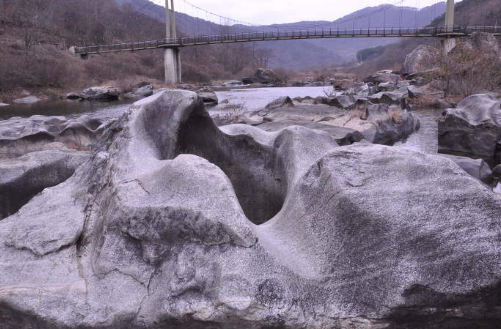 용궐산의 매력은 하늘에만 있지 않다. 산 아래 장군목 유원지에는 수만 년간 거센 물살이 조각해 놓은 기묘한 바위들이 약 3km에 걸쳐 갤러리를 이루고 있다. 그중에서도 가장 유명한 것은 **요강바위(요강바위)**다. 이름처럼 요강 모양으로 움푹 파인 이 바위는 한국전쟁 당시에는 피난처가 되어주었고, 아이를 낳지 못하는 여인이 지성을 들이면 아이를 가질 수 있다는 신비로운 전설을 품고 있다. 한때 억대의 가치가 있다는 소문에 도난당했다가 1년 6개월 만에 되찾아온 파란만장한 사연까지 더해져, 장군목의 상징적인 존재로 자리 잡고 있다.