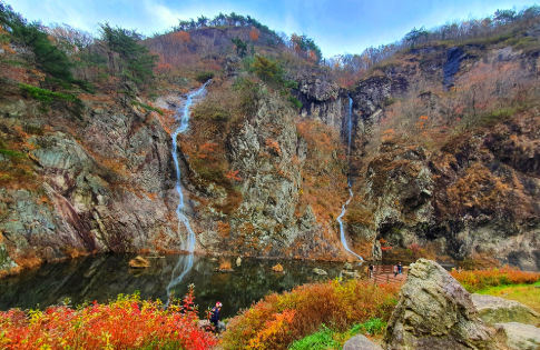 계곡 산책의 대미를 장식하는 것은 **구장군폭포(九將軍瀑布)**다. 마한 시대, 아홉 명의 장수가 패전을 각오하고 출전하기 전 이곳에서 죽기를 맹세하고 승리를 거두었다는 전설이 깃든 곳이다. 높이 120m의 거대한 암벽에서 세 줄기의 물줄기가 쏟아지는 모습은 그야말로 장관이다. 이 폭포 역시 인공적으로 조성되었지만, 남근과 여근을 형상화한 독특한 바위 형태와 어우러져 신비로운 분위기를 자아낸다. 폭포 옆에는 한 가지 소원은 꼭 들어준다는 작은