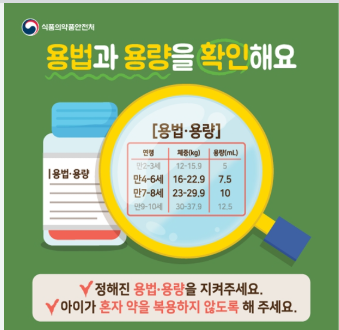 물약 (시럽제): 정확한 용량 측정을 위해 약과 함께 제공된 계량컵, 스포이드, 주사기 등을 사용해야 합니다. 주방용 숟가락은 절대 사용하지 않습니다. 복용 전 충분히 흔들어 약물이 고르게 섞이도록 합니다.