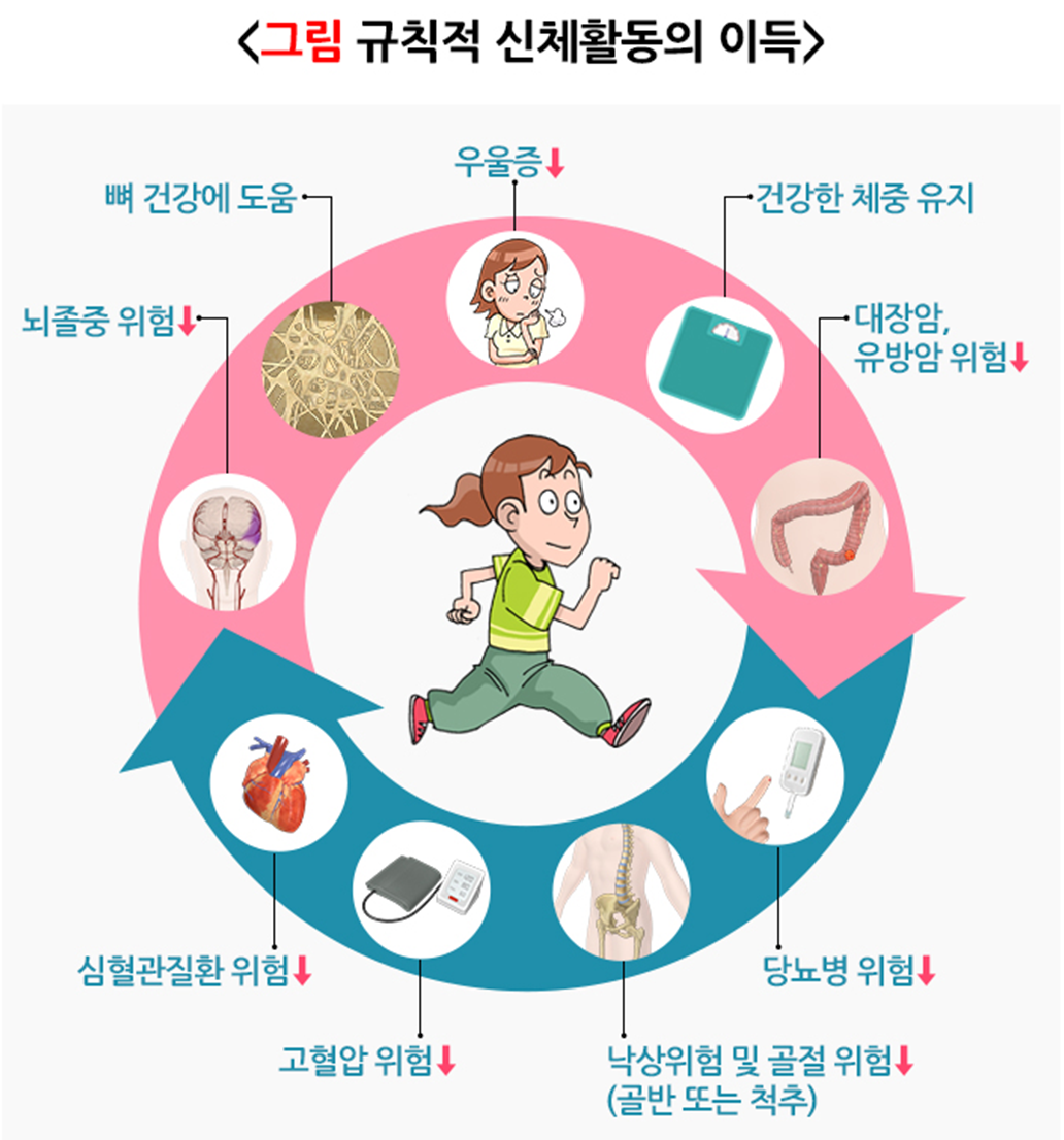 건강을 위한 가장 중요한 권장 사항 중 하나는 신체적 운동입니다. 규칙적인 운동은 심혈관계 질환, 당뇨, 골다공증, 암 등을 예방하는 효과가 있으며, 신체 건강 없이는 정신 건강도 존재하기 어렵습니다. 격렬한 운동보다는 자신의 체력에 적당한 수준의 운동, 즉 땀이 촉촉하게 나는 유산소 운동이 적절하며, 최소 일주일에 3회, 30~40분 정도가 권장됩니다.