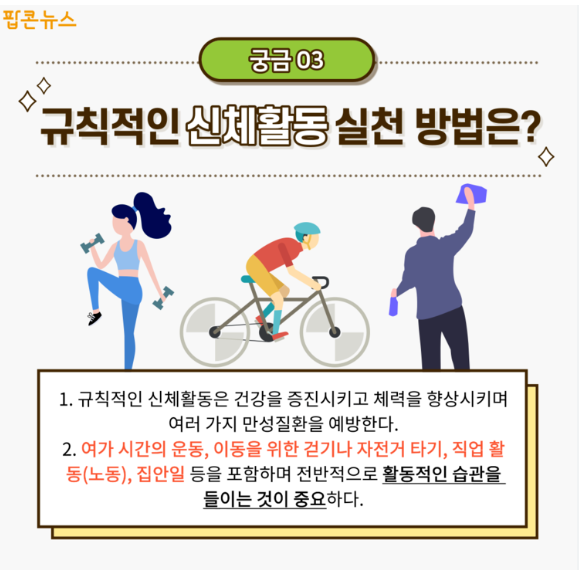 규칙적인 신체 활동은 심폐 기능 향상, 체중 관리, 정신 건강 증진 등 전반적인 건강에 필수적인 요소입니다. 단순히 운동 시간을 확보하는 것을 넘어, 일상생활 속에 신체 활동을 자연스럽게 통합하는 것이 중요합니다.