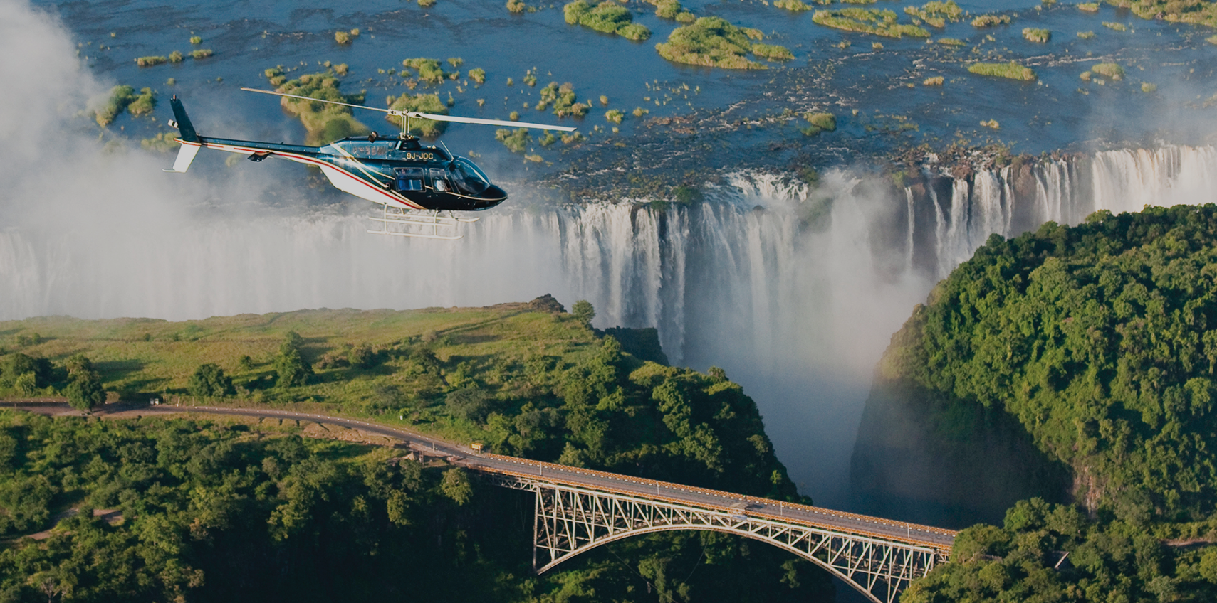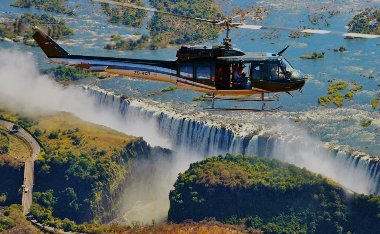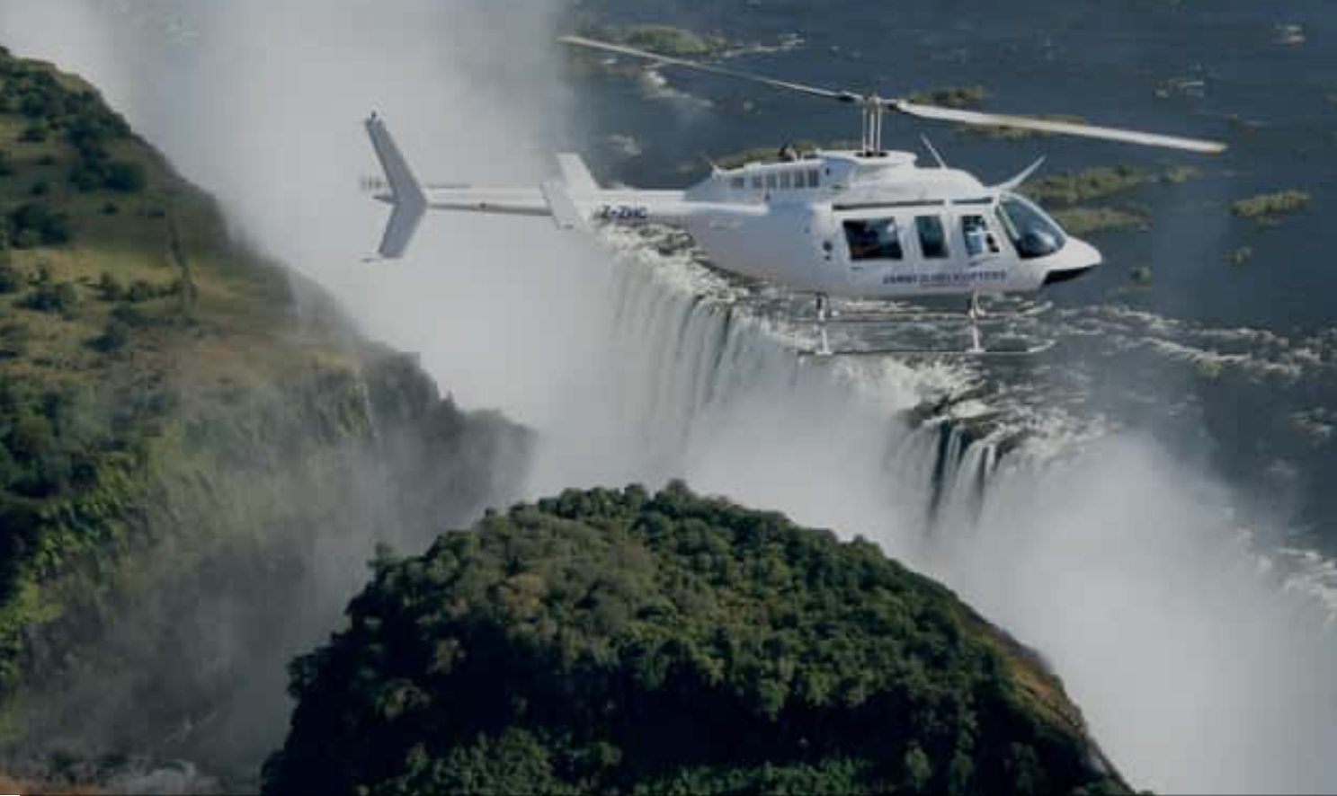 헬리콥터 착륙장은 마을에서 5분 거리에 있어 이륙 후 거의 바로 폭포 상공으로 이동합니다. 일반적으로 15분에서 22분 코스로 운영되며, 폭포 상류의 잠베지강, 폭포 전체, 바토카 협곡, 그리고 주변 국립공원 위를 비행하며 숨 막히는 경치를 감상할 수 있습니다. 헬기는 탑승객 모두가 폭포를 잘 볼 수 있도록 폭포를 오른쪽으로 한 바퀴, 왼쪽으로 한 바퀴씩 돌아주는 배려를 합니다. 특히 건기가 아닌 시기에는 충분한 수량과 함께 폭포의 물안개로 인해 생기는 멋진 무지개를 하늘에서 만날 수 있으며, 밤에도 무지개를 볼 수 있다는 점은 놀라운 경험입니다.