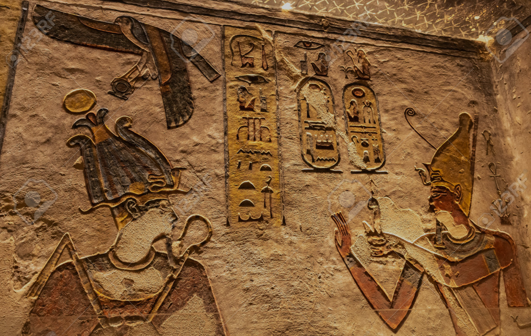 신전 내부의 벽화는 여전히 선명한 색상을 유지하고 있으며, 조각품들은 정교하게 제작되었습니다. 특히 의식이 거행되었을 것으로 추정되는 공간은 외부와는 다른 신비로운 분위기를 자아내며, 검은색 천장과 더욱 생생한 색상의 벽화가 인상적입니다.