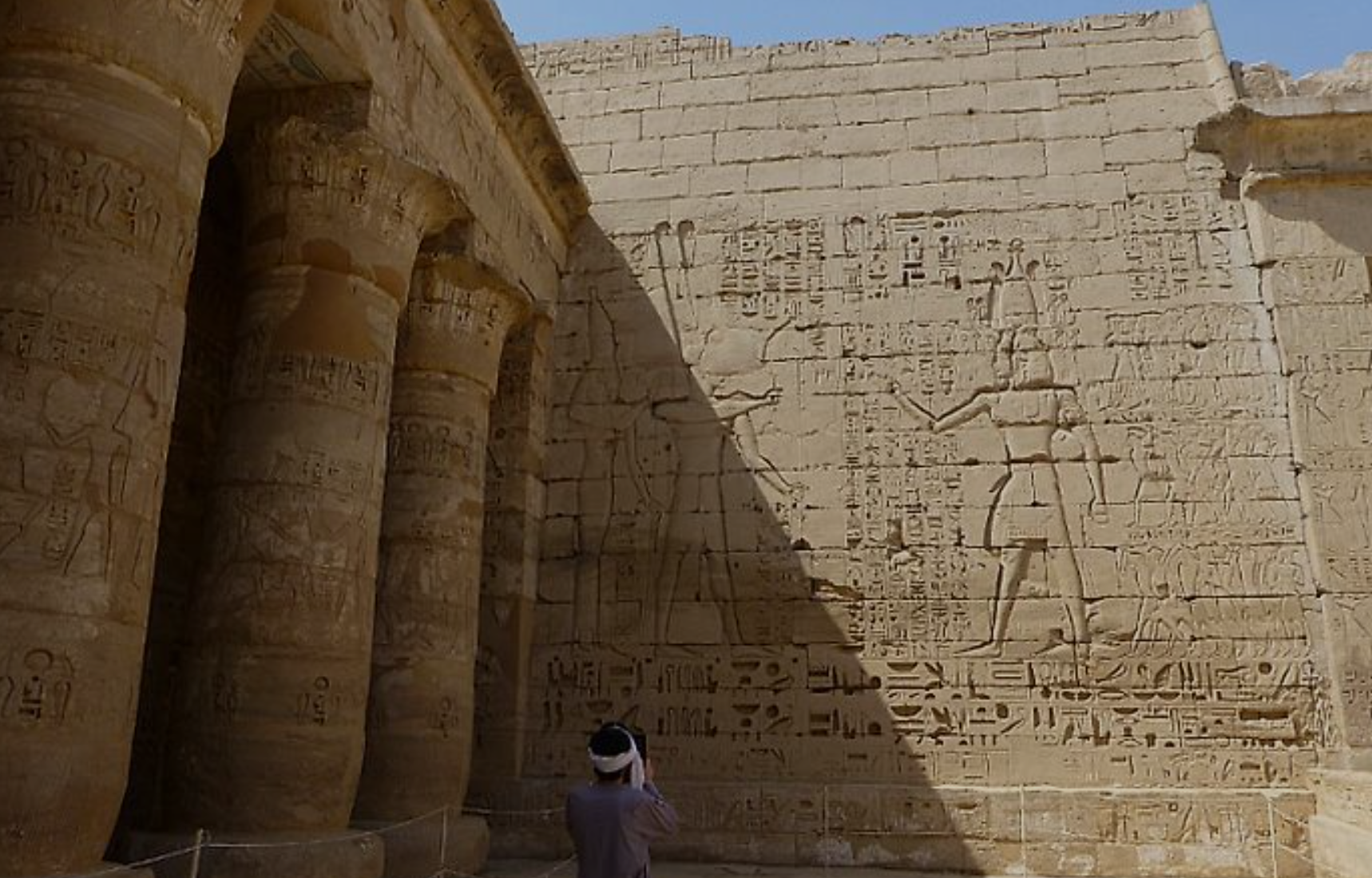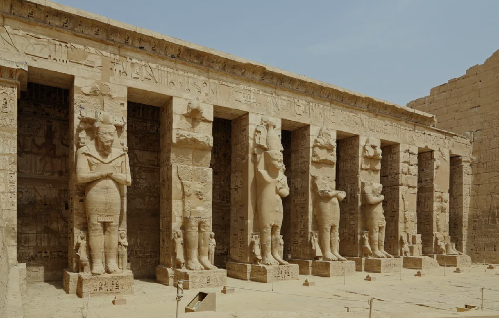 룩소르 서안에 위치한 높이 약 17m의 거대한 석상으로, 원래는 아멘호테프 3세가 건축한 장제전의 정문을 지키던 두 개의 석상입니다. 과거에는 지진으로 인한 틈새로 소리가 들려와 '신의 목소리'로 불렸으나, 복원 후에는 소리가 사라졌습니다. 이집트 한복판에 그리스 신화 인물의 이름을 딴 석상이 있다는 점은 로마의 영향을 보여줍니다. 멤논의 거상은 무료로 입장 가능합니다.