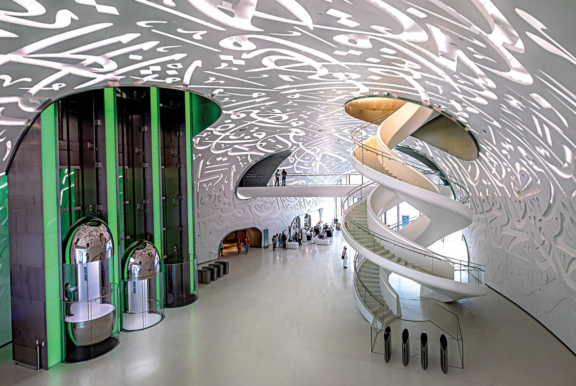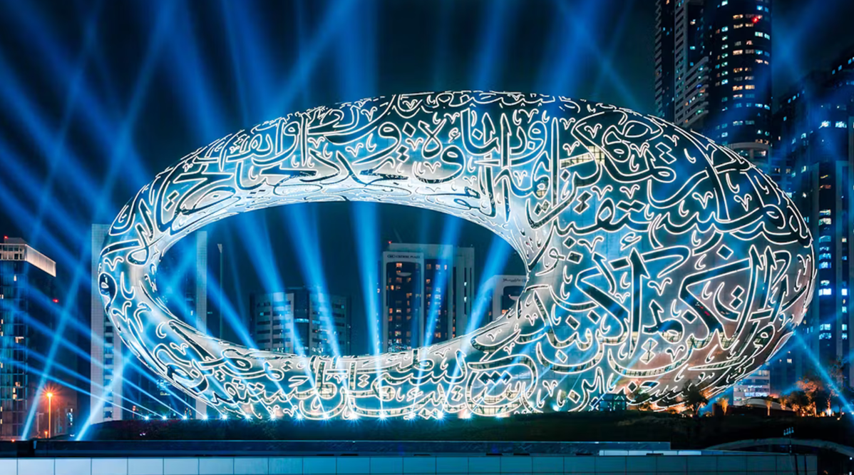 미래 박물관은 그 독특한 외관만으로도 시선을 사로잡습니다. 가운데가 뻥 뚫린 도넛 모양의 구조를 띠고 있으며, 최고 높이 77m에 달함에도 불구하고 내부에 단 하나의 기둥도 존재하지 않는 혁신적인 설계가 특징입니다. 이는 킬라 디자인(Killa Design)의 건축가 숀 킬라(Shaun Killa)의 작품으로, 복잡한 기하학적 형상을 구현하기 위해 파라메트릭 디자인과 빌딩 정보 모델링(BIM) 기법이 활용되었습니다. 1,024개의 패널로 이루어진 외관은 14,000m에 달하는 조명으로 밤에도 화려하게 빛나며, 외관 작업에만 1년 6개월이 소요될 정도로 정교하게 제작되었습니다.