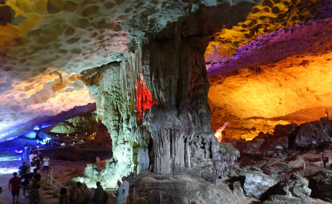 티엔 쿵 동굴 (Thien Cung Cave): 항구에서 가까운 곳에 위치하며, 복잡한 종유석과 석순, 그리고 색색의 조명이 어우러져 마치 마법 같은 궁전에 들어선 듯한 신비로운 분위기를 연출합니다.