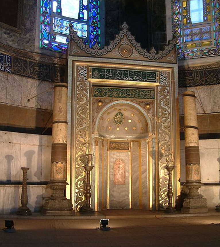 미흐라브: 앱스 내부에 위치하며 메카 방향을 향하는 화려한 벽감으로, 오스만 시대에 추가되었습니다. 그 풍부한 색상과 정교한 디자인은 비잔틴과 이슬람 양식의 융합을 상징합니다.