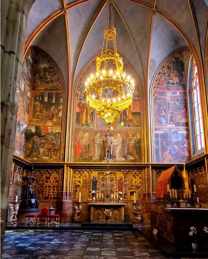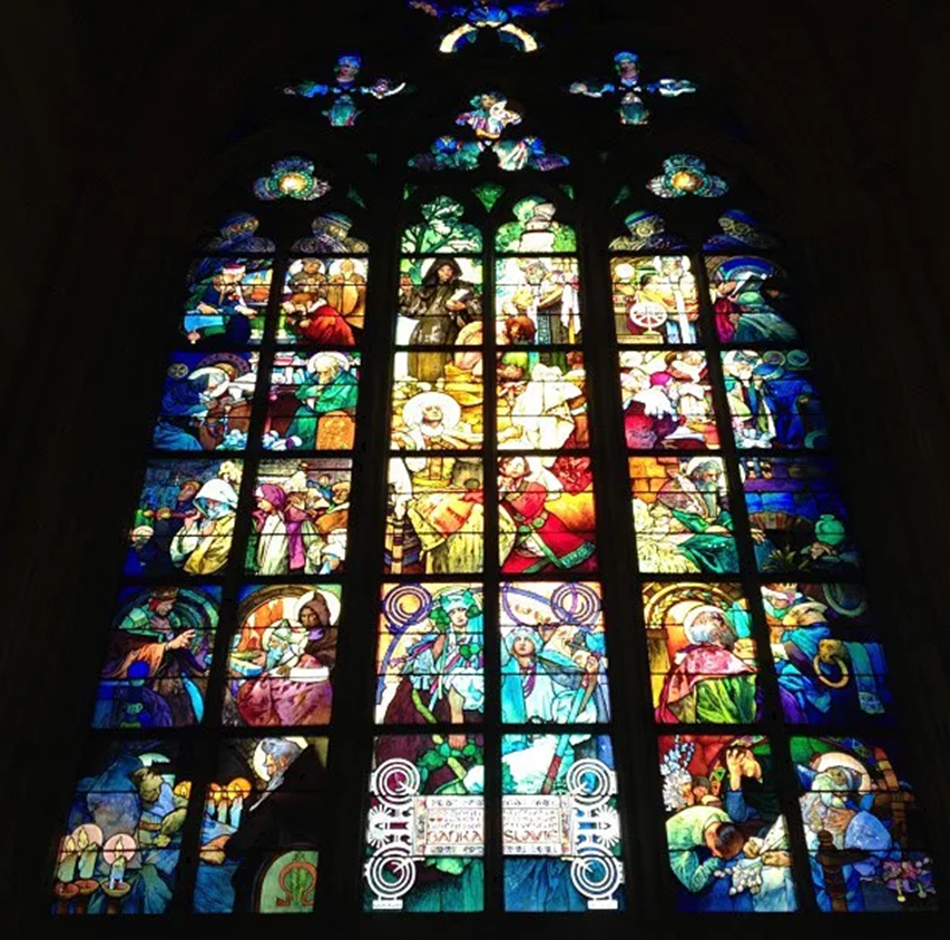 성당 내부의 화려한 스테인드글라스는 대부분 체코의 국민 화가 알폰스 무하의 작품으로, 자연 채광을 받아 빛나는 모습이 정말 아름답습니다. 사진으로는 그 영롱함을 온전히 담아내기 어려우므로, 직접 눈으로 감상하는 것이 필수적입니다. 성당 남쪽 탑에는 287개의 계단이 있는데, 이곳을 오르면 프라하 시내의 붉은 지붕, 블타바 강, 그리고 프라하 성 단지 전체를 아우르는 숨 막히는 파노라마 전경을 감상할 수 있는 최고의 전망대입니다.