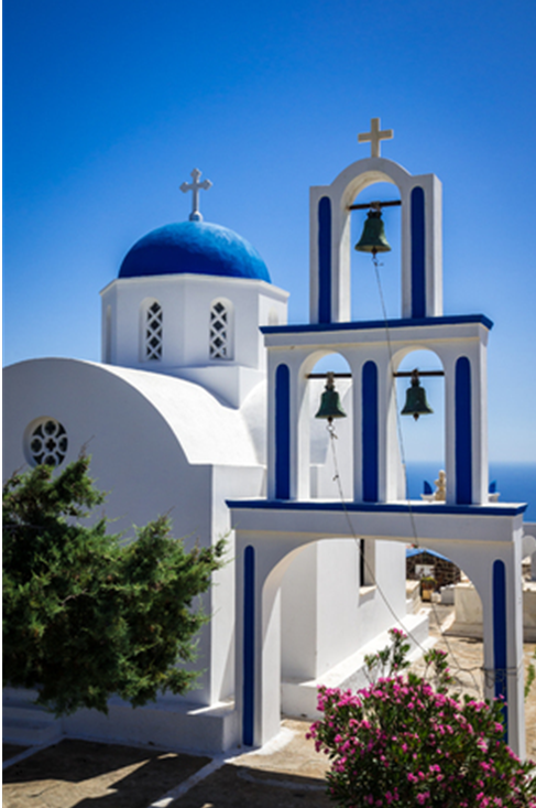 피라의 세 종 (Three Bells of Fira): 산토리니 엽서에 자주 등장하는 파란 돔 지붕과 흰 종탑이 있는 인기 포토 스팟입니다. 구글맵에서 'Three Bells of Fira iconic viewpoint'를 검색하면 쉽게 찾아갈 수 있습니다.