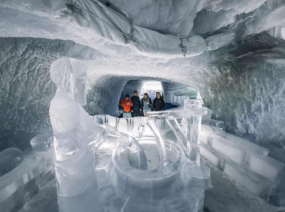 정상에서는 영원한 얼음 속에 위치한 '빙하 궁전(Glacier Palace)'을 탐험할 수 있습니다. 이곳에서는 빙하에 조각된 섬세한 얼음 조각품과 수 세기 동안 형성된 얼음 터널을 직접 체험하며 신비로운 얼음 세계에 빠져들 수 있습니다. 또한, 38개 봉우리와 14개 빙하를 한눈에 담을 수 있는 관측대는 알프스의 웅장함을 온몸으로 느끼게 합니다.