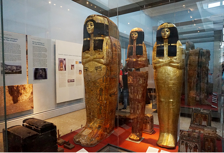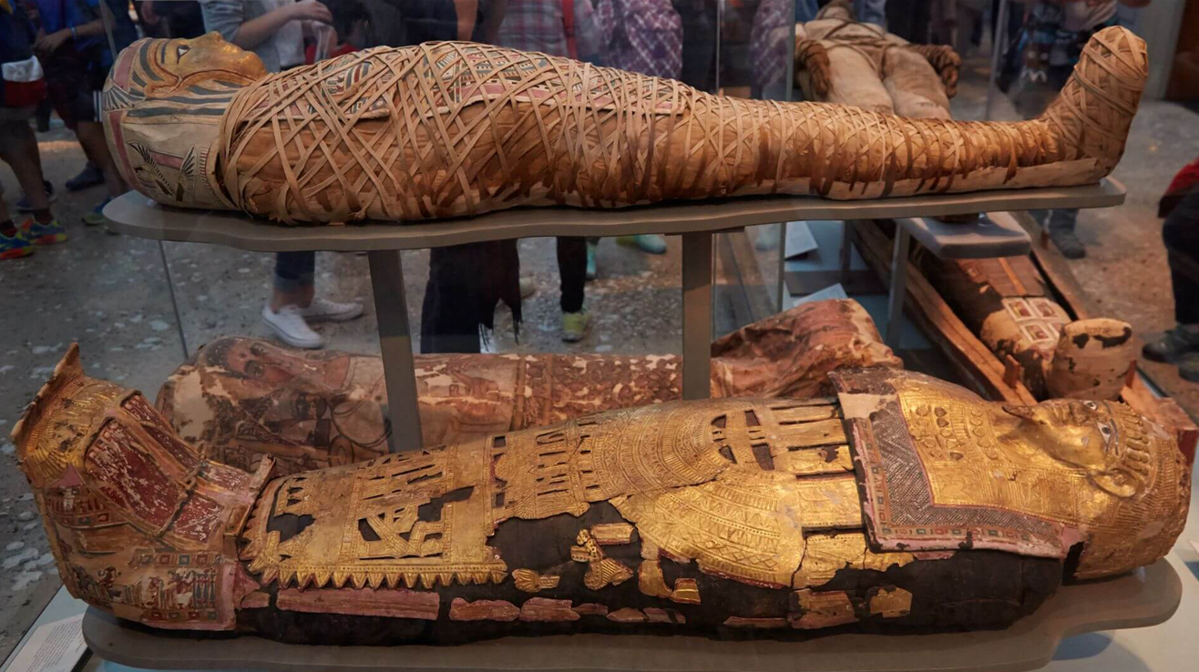 주요 전시물로는 기원전 3400년경의 선왕조 시대 미라로, 뜨겁고 건조한 사막 모래에 자연적으로 보존된 '진저맨(Gebelein man)'이 있습니다. 그의 생강색 머리카락, 손톱, 치아 흔적을 여전히 볼 수 있으며, 현대 과학 분석 결과, 그는 날카로운 도구에 의한 외상으로 사망했을 가능성이 제기되었습니다. 진저맨은 64호실에서 관람할 수 있습니다. 기원전 220년경 제작된 '호르네드즈테프의 미라(Mummy of Hornedjitef)'는 정교한 목관과 미라, 데스마스크 덕분에 유명하며 , 아문 신의 여가수였던 '카테베트의 미라(Mummy of Katebet)'는 기원전 1300년경의 유물임에도 놀랍도록 잘 보존되어 63호실에서 관람할 수 있습니다.