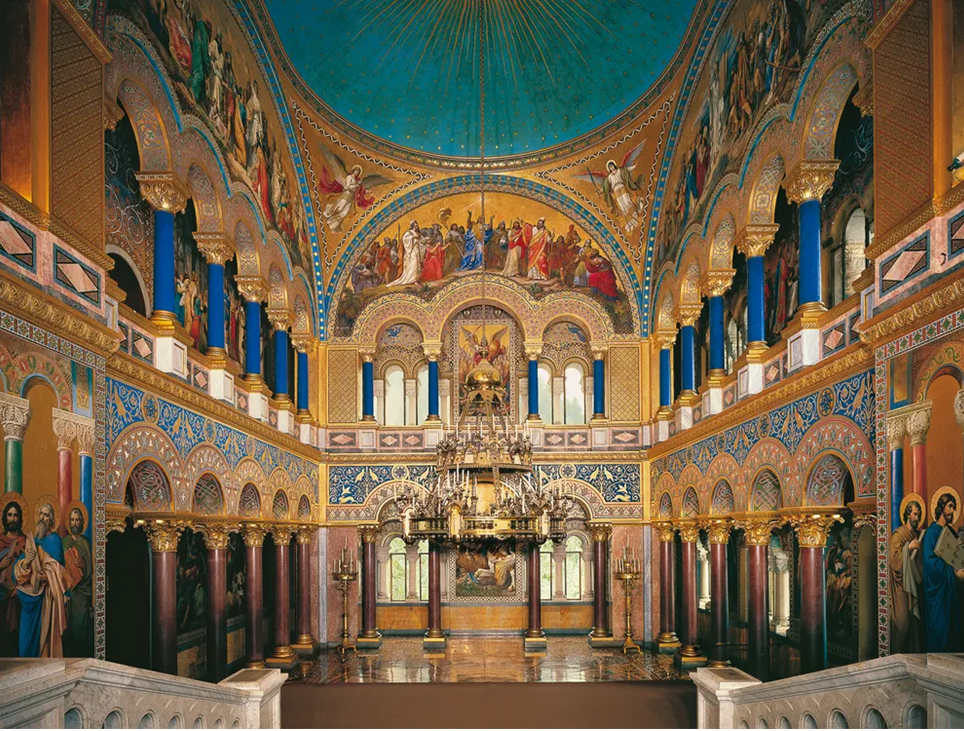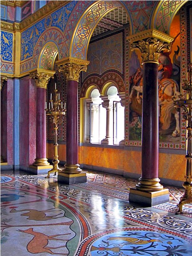 왕좌의 방(Throne Room): 비잔틴 양식에서 영감을 받은 이 방은 웅장한 돔과 아치가 특징입니다. 왕의 권위를 상징하는 왕좌가 놓일 플랫폼이 마련되어 있었지만, 왕좌는 끝내 제작되지 못했습니다. 이는 왕의 꿈이 현실에서 완전히 실현되지 못했음을 상징하는 듯합니다.