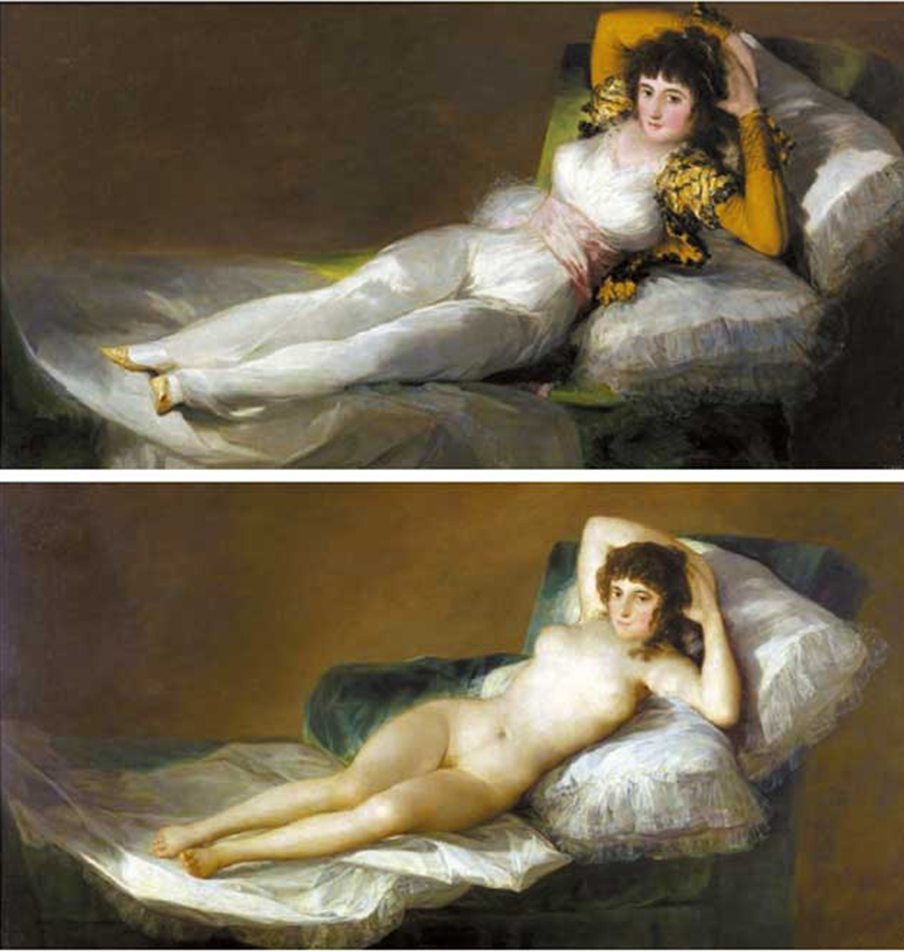 특히, 벨라스케스의 대표작 <시녀들>은 그림 속에 화가 자신이 등장하여 당시 왕실 소속 화가로서의 자부심을 드러낸 것으로 평가받는다. 한편, 고야의 <옷을 벗은 마하>와 <옷을 입은 마하>는 서양 예술사 최초의 등신대 여성 누드화로 평가되지만, 이 작품들로 인해 고야는 70세의 나이에 종교 재판에 회부되는 시련을 겪었다.