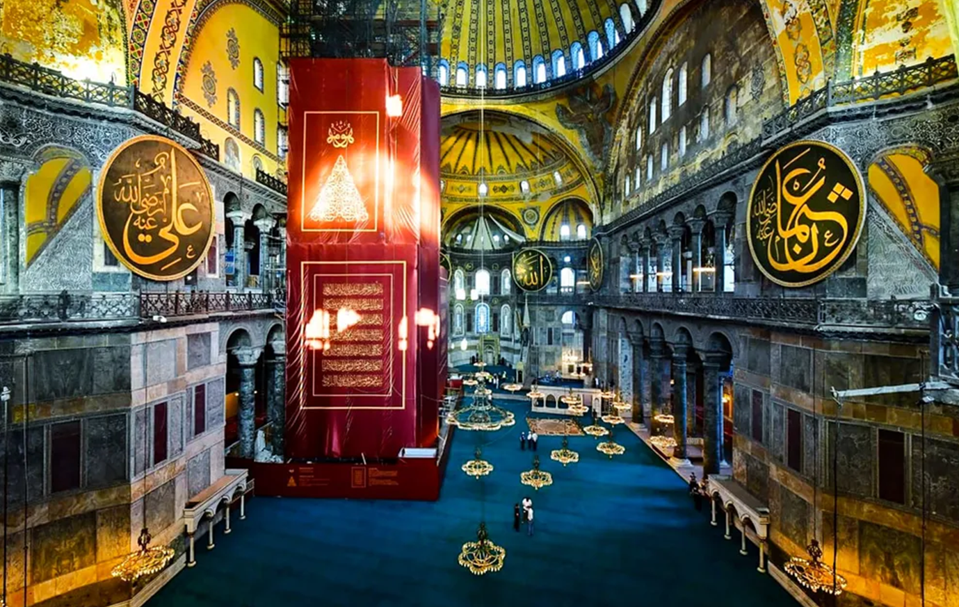 내부는 녹색, 백색, 자주색 반암 대리석과 화려한 황금 모자이크로 장식되어 있었으며, 오스만 시대에는 거대한 서예 메달이 추가되어 각 시대의 종교적 헤게모니를 시각적으로 보여준다.