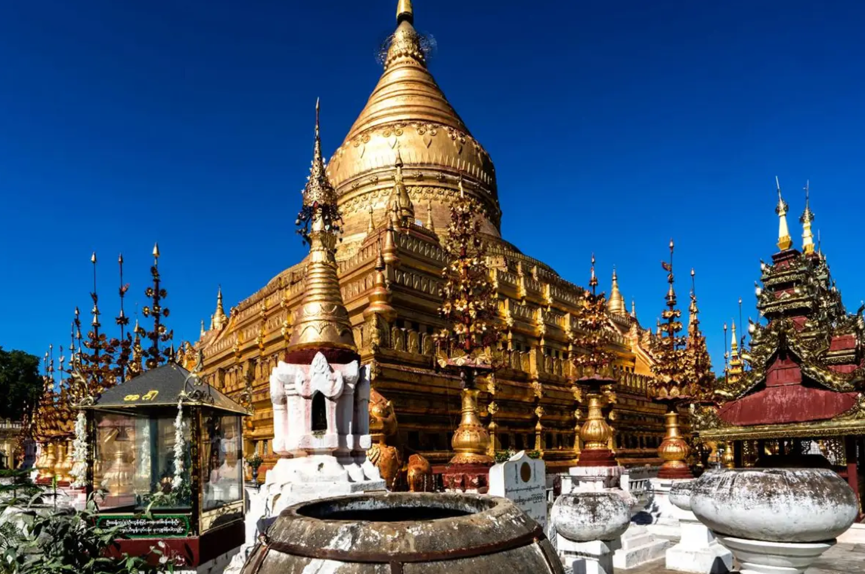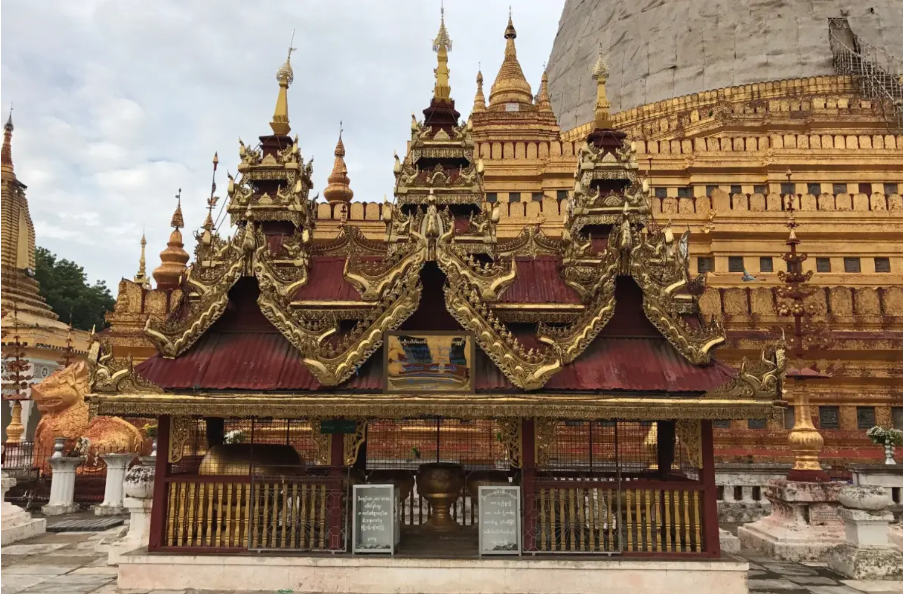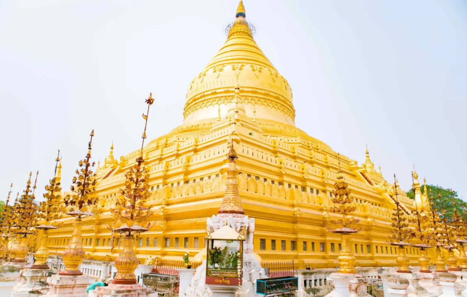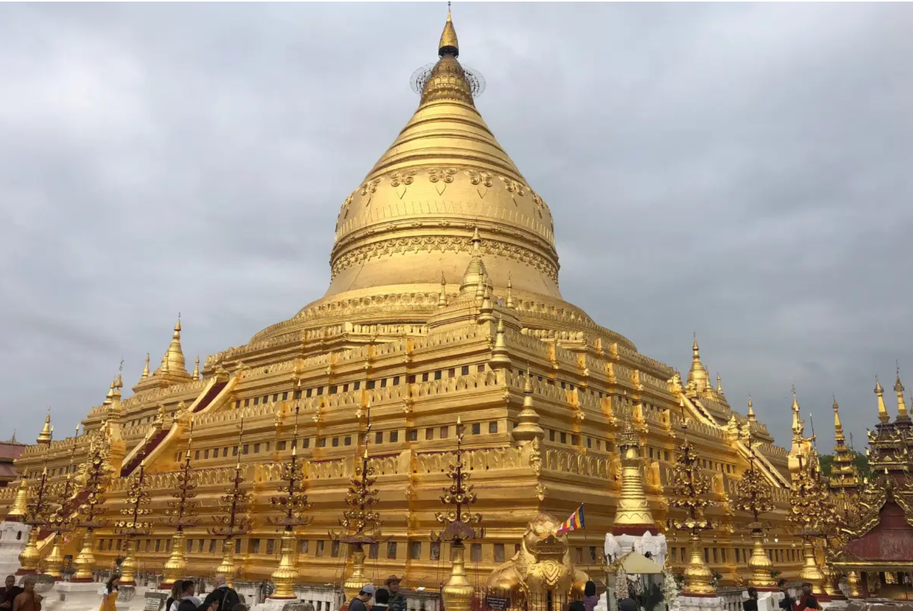 바간 순례의 시작은 단연 쉐지곤 파고다(Shwezigon Pagoda)여야 한다. 미얀마 최초의 통일 군주 아노라타 왕이 건립을 시작하여 짠싯따(Kyansittha) 왕 시대인 1085년경 완성된 이 사원은 바간 왕조의 정신적 구심점이자 이후 미얀마 파고다 건축의 원형이 된 기념비적인 건축물이다.'황금 모래 언덕의 사원'이라는 이름처럼 , 거대한 종 모양의 주탑(stupa) 전체가 화려한 금박으로 덮여 있어 태양 아래 눈부시게 빛난다.