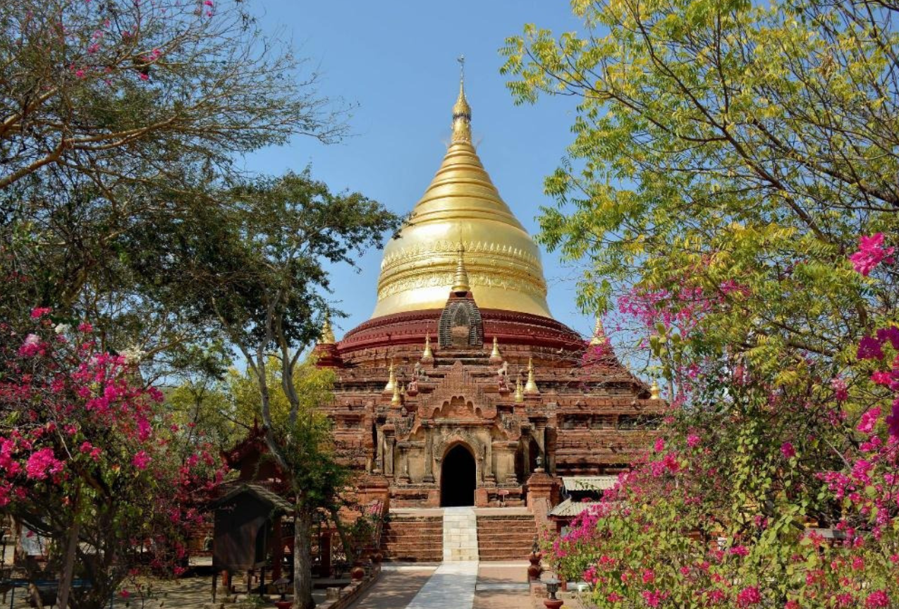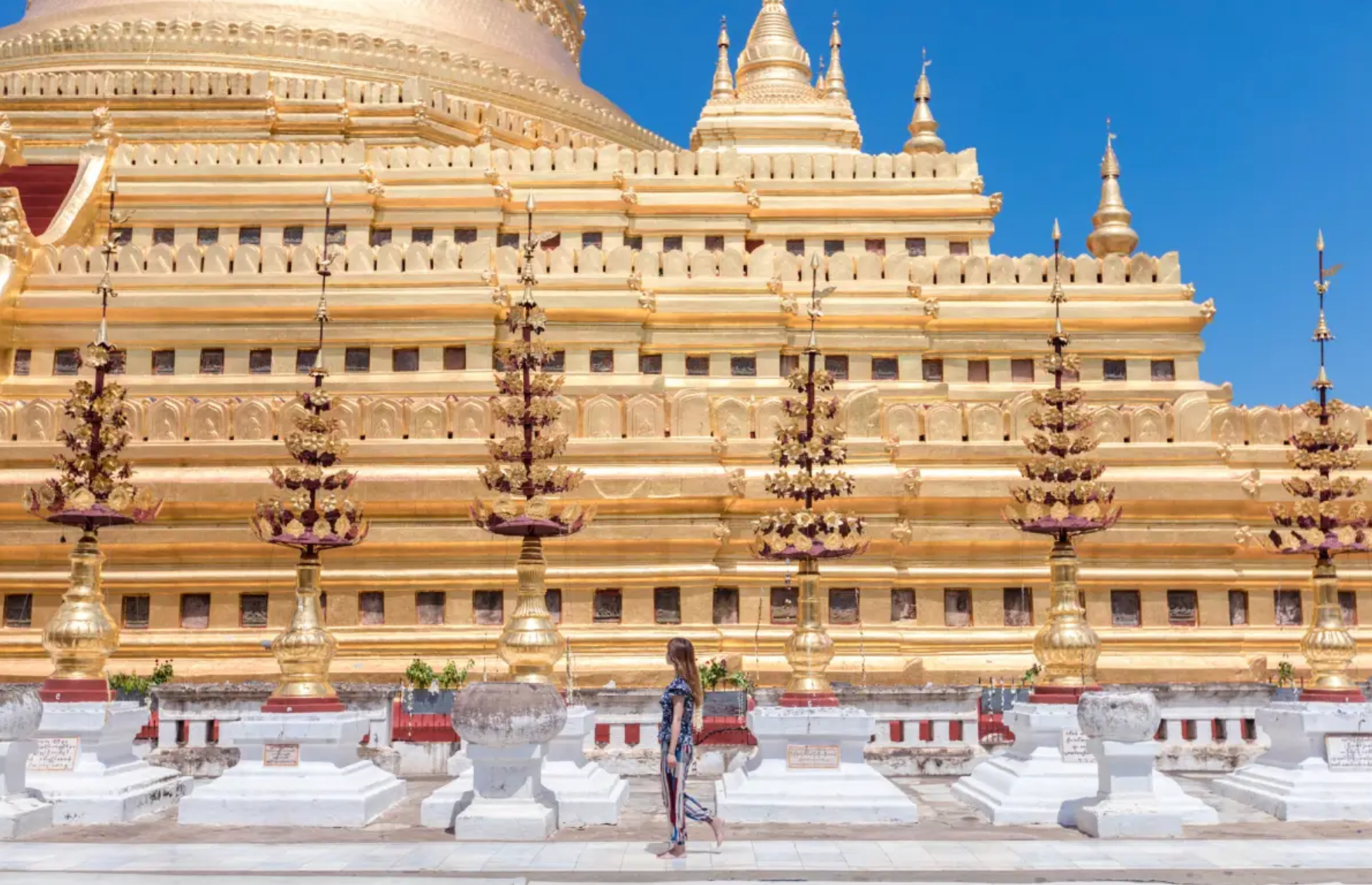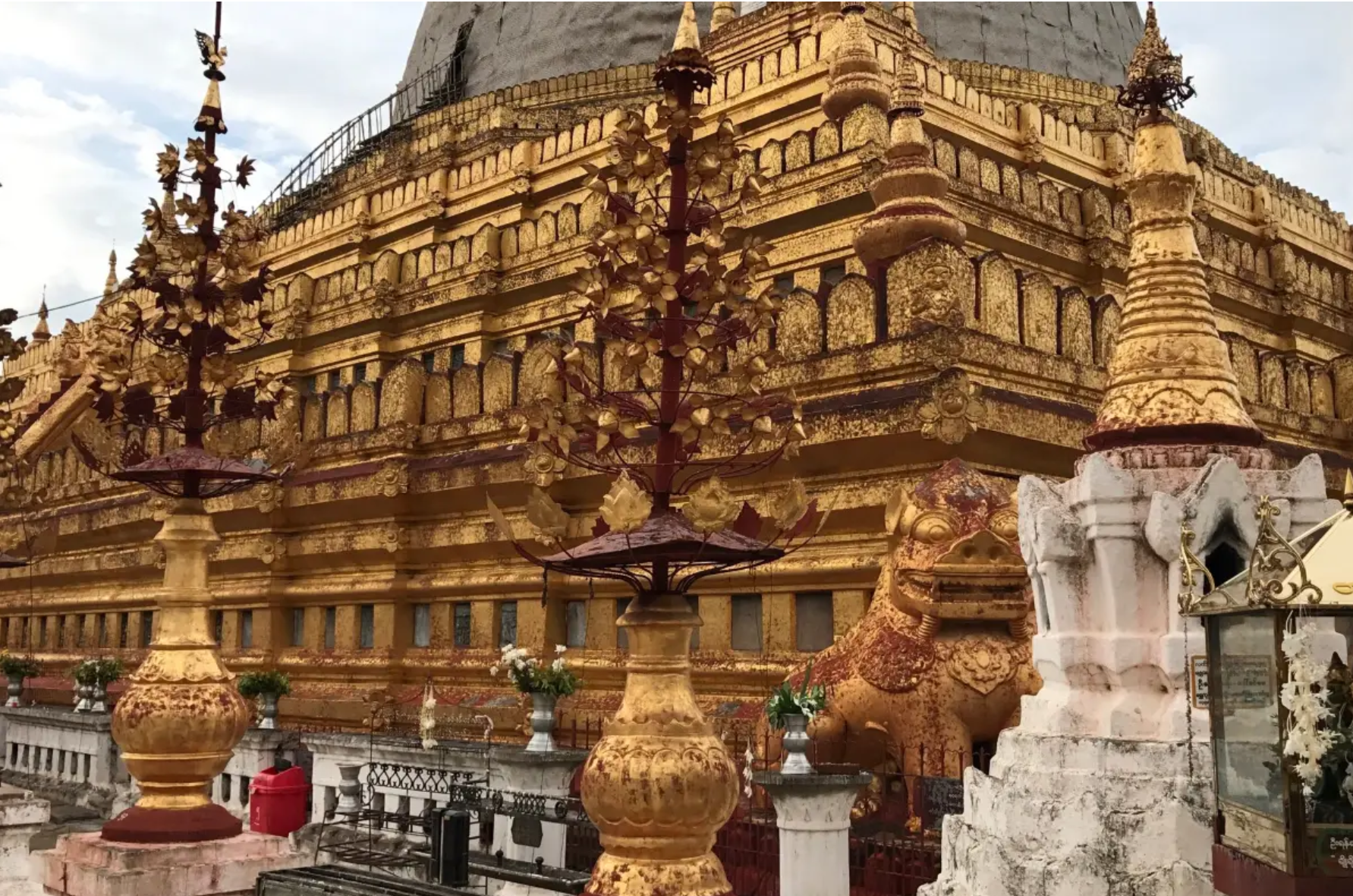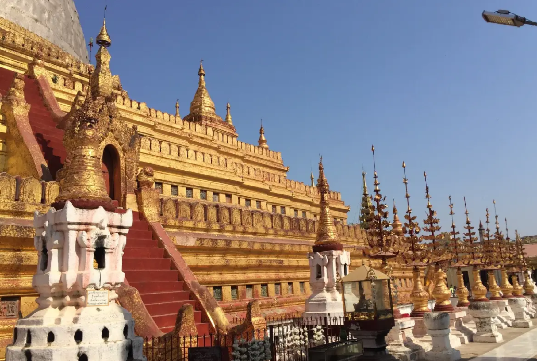 바간 순례의 시작은 단연 쉐지곤 파고다(Shwezigon Pagoda)여야 한다. 미얀마 최초의 통일 군주 아노라타 왕이 건립을 시작하여 짠싯따(Kyansittha) 왕 시대인 1085년경 완성된 이 사원은 바간 왕조의 정신적 구심점이자 이후 미얀마 파고다 건축의 원형이 된 기념비적인 건축물이다.'황금 모래 언덕의 사원'이라는 이름처럼 , 거대한 종 모양의 주탑(stupa) 전체가 화려한 금박으로 덮여 있어 태양 아래 눈부시게 빛난다.