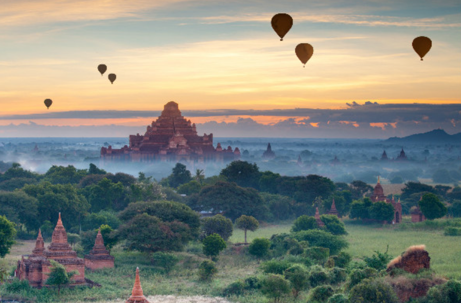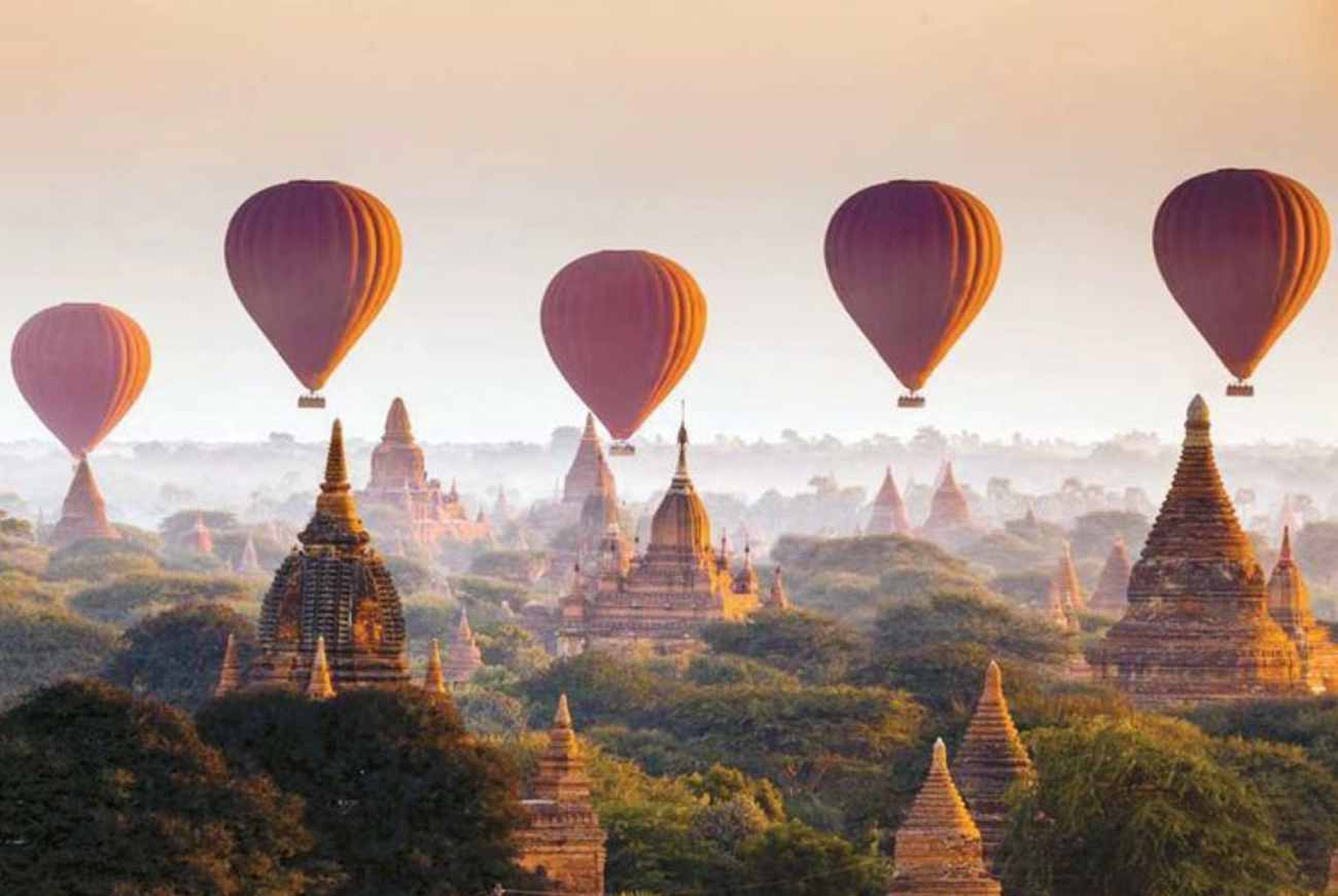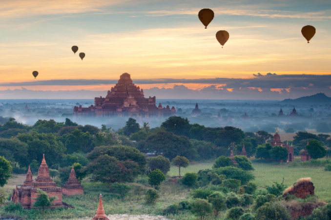 바간의 일출은 세상에서 가장 아름다운 풍경 중 하나로 꼽힌다. 새벽안개가 자욱하게 깔린 평원 위로 붉은 태양이 떠오르기 시작하면, 수많은 사원과 탑들이 하나둘씩 신비로운 모습을 드러낸다.이 경이로운 장면에 형형색색의 열기구들이 천천히 떠오르는 모습이 더해지면, 그야말로 한 폭의 그림 같은 풍경이 완성된다.